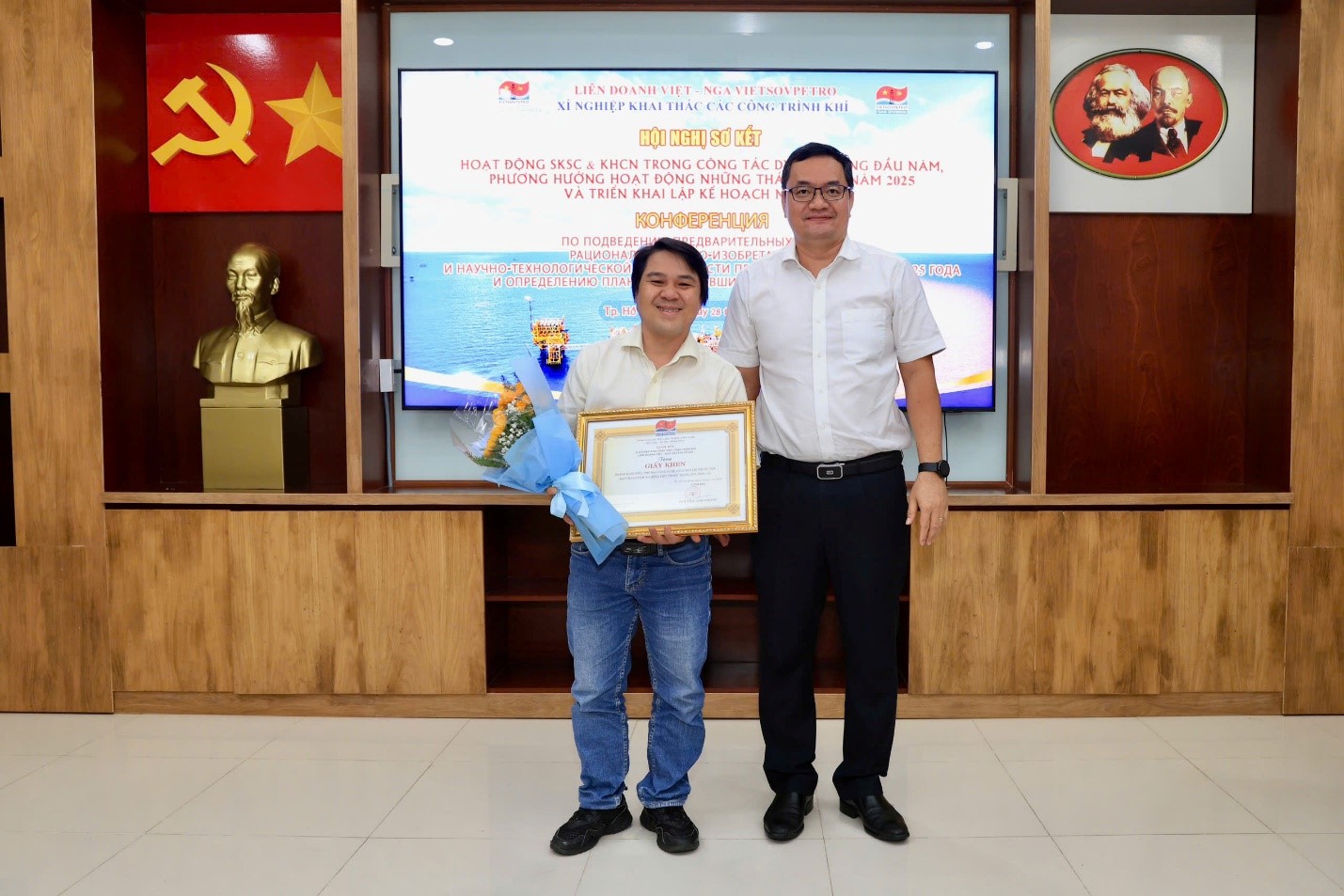 Ông Nguyễn Thanh Phong - Phó Bí thư Đảng ủy, Phó giám đốc XN, Chủ tịch Hội đồng SKSC-KHCN – trao bằng khen cho ông Hoàng Minh Hiếu – Phó Ban Công nghệ, Giàn nén khí Trung tâm – đạt thành tích “Cá nhân tiên phong trong ứng dụng AI”