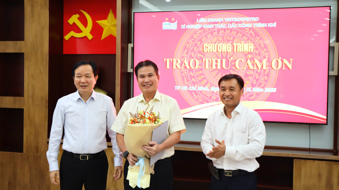 Cũng trong chương trình, thay mặt Ban Lãnh đạo Vietsovpetro, ông Lê Việt Dũng - Chánh Kỹ sư đã Trao thư cảm ơn cho ông Nguyễn Anh Phong - Giám đốc XN Khí, ghi nhận những đóng góp bền bỉ, chân thành và đầy tâm huyết của ông trong suốt chặng đường công tác.