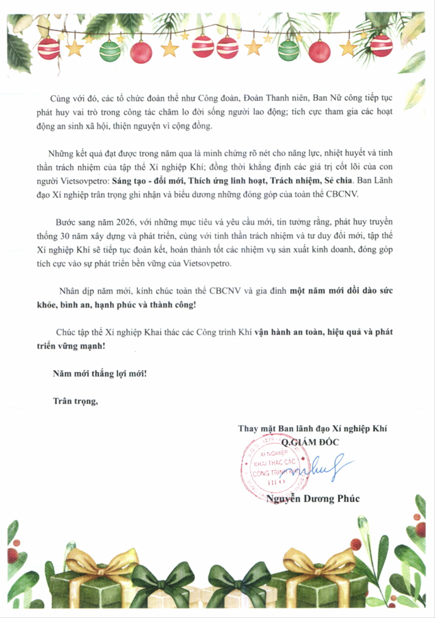 THƯ CHÚC MỪNG NĂM MỚI 2026 CỦA GIÁM ĐỐC XN KHÍ