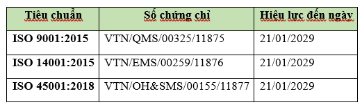 • ISO 9001:2015 – Hệ thống Quản lý Chất lượng: Khẳng định năng lực của Xí nghiệp trong việc cung cấp sản phẩm và dịch vụ đạt chuẩn, đáp ứng cao nhất mọi yêu cầu của khách hàng và đối tác.