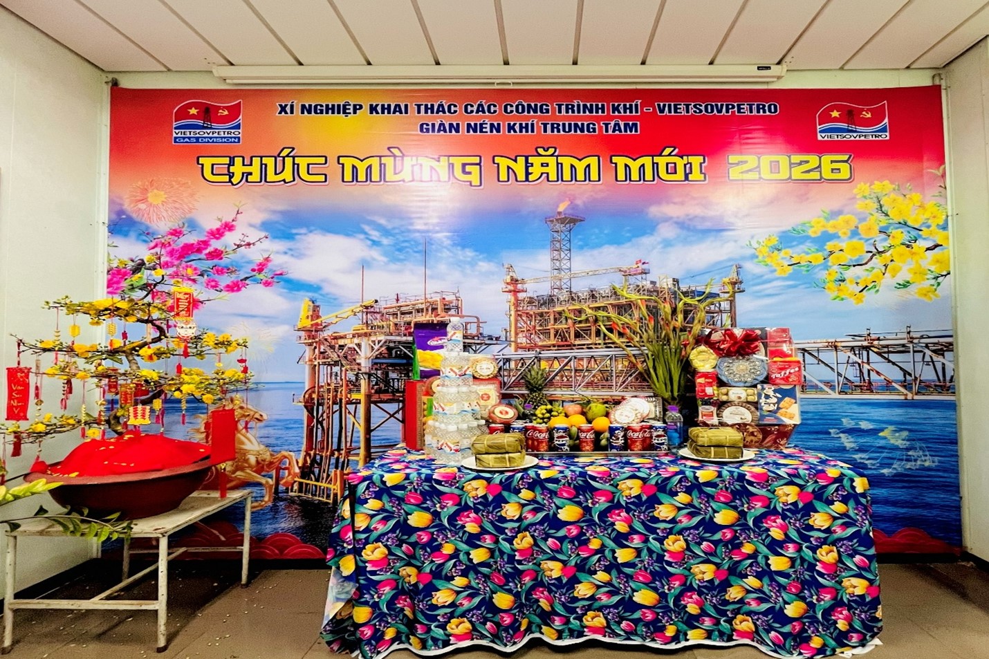 Giữa nhịp máy vận hành hối hả, không khí Tết vẫn kịp lan tỏa đến từng góc nhỏ, thắp lên niềm vui và sự náo nức cho tất cả CBCNV trên giàn. Tranh thủ giờ nghỉ giải lao, mọi người cùng nhau trang hoàng, treo băng rôn rực rỡ, gói bánh chưng, chuẩn bị mâm ngũ quả và chăm chút tỉ mỉ từng nhành hoa mai vàng, đào hồng thắm đón Tết. GNTT những ngày này không chỉ là nơi làm việc, mà đã thực sự trở thành một "ngôi nhà thứ hai" ấm cúng, nơi tình đồng nghiệp gắn bó giữa trùng khơi giúp vơi đi nỗi nhớ nhà, tất cả cùng sẵn sàng cho một mùa Xuân Bính Ngọ 2026 đầy quyết tâm và hy vọng.