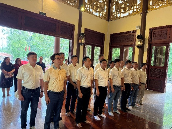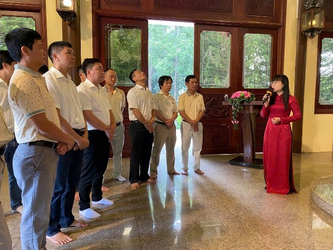 Đoàn thành kính dâng hương và nghe hướng dẫn viên giới thiệu về quá trình xây dựng Đền thờ Bác Tôn