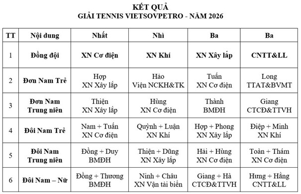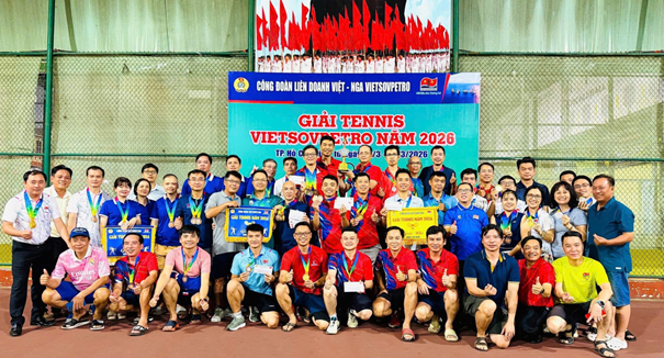 Thành công tại giải Tennis Vietsovpetro năm 2026 tiếp tục là minh chứng cho sự quan tâm, tạo điều kiện của lãnh đạo đơn vị và Công đoàn trong việc chăm lo đời sống tinh thần cho người lao động; đồng thời là động lực để phong trào thể dục thể thao tại XN Khí tiếp tục phát triển mạnh mẽ, hướng tới xây dựng môi trường làm việc năng động, đoàn kết và bền vững trong giai đoạn tới.