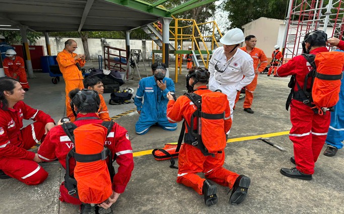 Dù vừa thực hiện nhiệm vụ sản xuất, vừa tham gia huấn luyện, các thành viên trong đội vẫn chủ động sắp xếp thời gian, duy trì tinh thần kỷ luật và sự tập trung cao độ. Xuyên suốt quá trình chuẩn bị, toàn đội luôn quán triệt phương châm “Safety First – An toàn là trên hết”, xem đó là nguyên tắc cốt lõi trong mọi hành động và quyết định. Song song với huấn luyện thực hành, đội còn tích cực ôn luyện phần thi lý thuyết nhằm củng cố kiến thức về quy trình ứng cứu sự cố, an toàn, phòng cháy chữa cháy và sơ cấp cứu. Đây là nội dung đòi hỏi không chỉ kiến thức chuyên môn vững chắc mà còn cần khả năng phản xạ nhanh, chính xác trong thời gian giới hạn.